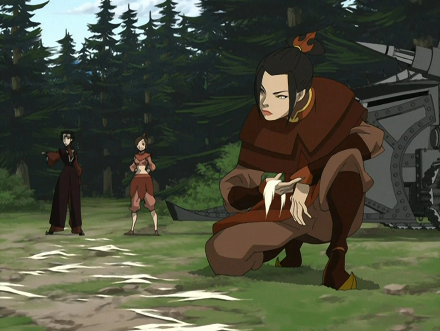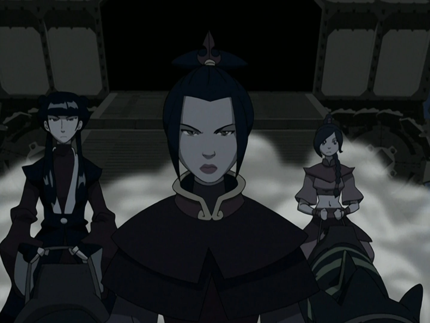 Nachdem Azula mit ihrem königlichen Hofstaat in das Erdkönigreich gereist war, um ihren Bruder und ihren Onkel festzunehmen, wurde sie von Lo und Li geraten, die imperialen Feuerbändiger aufzugeben, um das Überraschungsmoment aufrechtzuerhalten. Die Prinzessin der Feuernation erkannte, dass sie beweglich und flink sein musste, wenn sie ihre Aufgabe erfolgreich erfüllen wollte. So beschloss sie, den königlichen Hofstaat zugunsten eines kleinen Elite-Teams zu verlassen, das aus ihren zwei alten Freundinnen bestand: Mai und Ty Lee.[1]