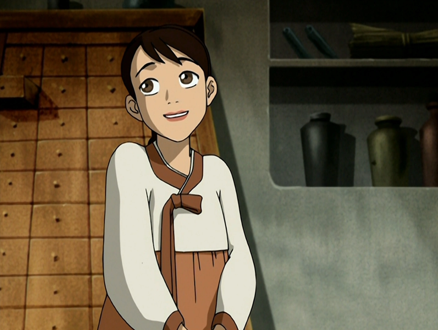 daraufhin, wo sie denn wohne. Als sie essen, fragt sie Zuko über seinen Vater aus und erklärt, dass ihr Vater im Krieg gestorben wäre. Etwas später setzt sie sich zu Zuko auf die Veranda und zeigt ihm eine Narbe an ihrem Bein, um Zuko zu zeigen, dass die Feuernation auch ihr wegetan hätte.