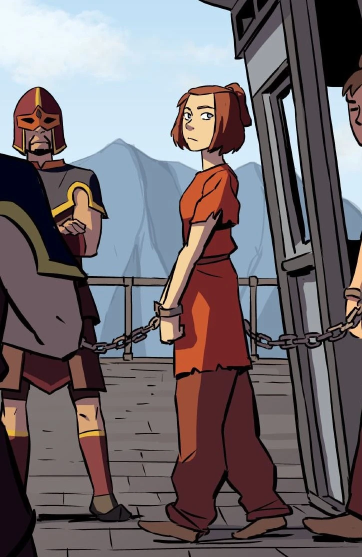 Nello stesso istante, Sokka, Suki e Zuko osservarono l’arrivo della gondola che portava i nuovi arrivati. Un passeggero dopo l’altro uscì, ma nessuno era Hakoda, il che iniziò a far disperare Sokka che iniziava a pentirsi della sua scelta. La sua disperazione si tramutò in gioia smisurata quando vide l’ultimo detenuto che usciva dalla gondola: suo padre.