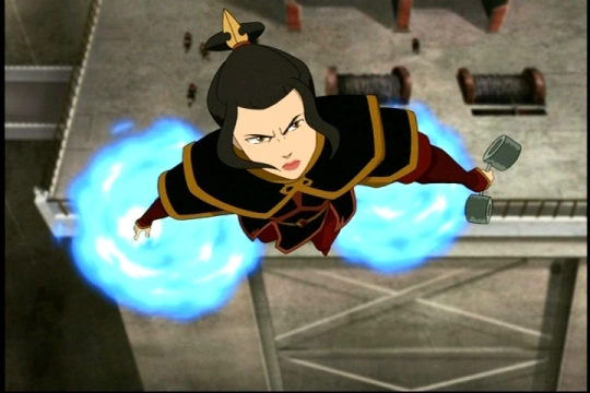 La loro gioia durò solo pochi minuti finché non si accorsero dell’arrivo di Azula e Ty Lee sulla piattaforma di partenza della funivia che si misero subito al loro inseguimento. Mentre l’acrobata da circo corse semplicemente sopra le funi, la dominatrice del fuoco volò usando la propulsione del fuoco dai piedi tenendosi alla fune con l’aiuto di un paio di manette. Le due ragazze affrontarono i fuggitivi sul tetto della funivia dove Azula se la prese con Sokka e Zuko e Ty Lee con Suki. Ty Lee tentò di usare nuovamente il blocco del Chi, ma Suki ormai sapeva rispondere alla sua tecnica e la tenne lontana, generando una situazione di stallo. Anche l’altro combattimento era molto più equilibrato del previsto con Zuko che riusciva stare dietro a sua sorella che una volta venne quasi colpita dalla spada di Sokka, ma evitò il colpo per il rotto della cuffia. I cinque continuarono a combattere sul tetto mentre, all'interno della cabina, Chit Sang perse il controllo sul direttore che si liberò e grido ai suoi soldati di tagliare immediatamente la fune, pronto a morire insieme ai fuggitivi.