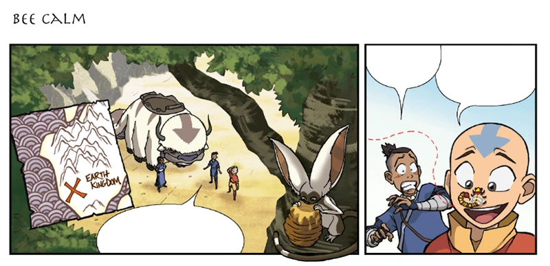 Rój skorpiopszczół przeraża Momo dokładnie w tym samym momencie, w którym Aang prosi przyjaciół o zachowanie spokoju.