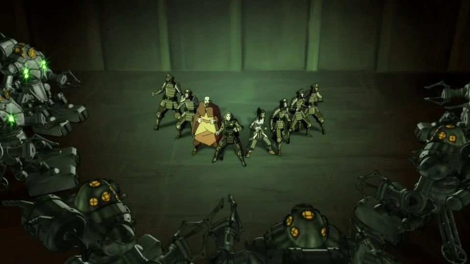 Тензина, Лин и Корру попытались спасти Болин и Мако, но их обнаружили. Хироши и Лейтенант приготовились атаковать их, когда в цех зашла Асами. Увидев дочь, Хироши предложил ей присоединиться к Уравнителям и протянул ей одну из электрических перчаток, которыми он был вооружён. Асами взяла перчатку и вырубила ею своего отца, а потом, выхватив электрическую палку из руки Лейтенанта, оглушила и его. Прихватив раненых товарищей, команда скрылась в тоннеле.