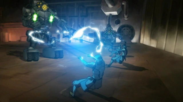 Один из танков запустил в магов металлический трос с захватом на конце, но они увернулись. Полицейские метнули несколько металлических лент и опутали ими клешни двух мехатанков, пытаясь обездвижить их. Но гидравлические "мускулы" роботов оказались намного мощнее, чем силы полицейских. Мехатанки выпустили электрический разряд из своих рук и вырубили полицейских. В это время Лин удалось запрыгнуть на корпус одной из машин и повредить её кабину. Потеряв равновесие, танк упал, но Лин пропустила атаку другого робота, который ухватил её захватом на конце троса и со всей силы швырнул на пол цеха.