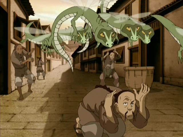 Аанг увидел летающих дракончиков в зоопарке Ба Синг Се, где они были заперты в тесную клетку. Когда Аватар хотел переместить всех животных на новое место, те разбежались по всему городу. Летающие дракончики атаковали прохожих, стремясь укусить их. Только применив свой свисток, Аанг смог собрать животных и вывести их за стены города, где создал новый зоопарк. («Истории Ба Синг Се»)