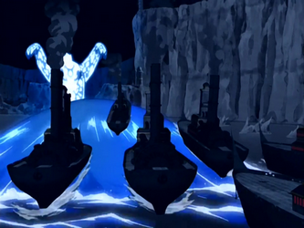 Aang, merged with the Ocean Spirit, drove off the Fire Nation Navy.