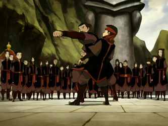 Aang and his friends left the North on a ship with Pakku and several others before flying to an Earth Kingdom base, from where they were to be escorted to Omashu in order for Aang to learn earthbending from King Bumi. The trio decided to travel alone as the general commanding the fortress tried to force Aang into the Avatar State, causing chaos and destruction.[30] Upon arriving at Omashu, they learned that the city had fallen to the Fire Nation.[31] Seeking to save the king, Aang and his friends evacuated citizens from the city in order to aid the Omashu Resistance, but in the process, the governor's son Tom-Tom followed them out. Team Avatar was sent a dragon hawk reporting that the governor would trade the king for his son, but Princess Azula reneged on the deal, leading to a skirmish between the Avatar and princess's allies. While he managed to find Bumi, the king told Aang that he would not leave Omashu, and encouraged him to find a master who embodied the principles of neutral jing. Before leaving Omashu on this quest, the team returned Tom-Tom.[32] While in the city of Gaoling, they heard about and attended a tournament that supposedly featured the best earthbenders in the world, hoping to find an earthbending teacher for Aang. At the end of the tournament, they witnessed the final fight between one of the popular contestants and the current champion, a blind girl. During the match, Aang realized the girl was the same one he had received a vision of while lost in the Foggy Swamp[33] and noticed her technique of waiting and listening before attacking, easily defeating her opponent. The ringmaster offered a sack of gold pieces to anyone who dared to face the Blind Bandit. Aang accepted the challenge in order to talk to the girl, but she ignored him after he caught her off guard by deflecting her attack with airbending.[34]