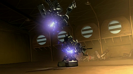 Following Varrick's return to the city, Asami somewhat grudgingly agreed to work with him at the president's request to defend the city against an Earth Empire invasion after it was anticipated by the United Republic.[38] Asami began to draw up blueprints for a new mecha suit with the ability to fly, which was based on the movements of dragonfly hummingbirds, revealing her plans to the president along with her friends and Varrick.[39] Asami began developing several prototypes at her office, before ordering the suits to go into production at Future Industries factories.[40]