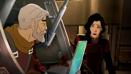 Although President Raiko refused to help Korra against Unalaq, Asami readily offered her assistance and traveled down to the South Pole with the rest of Team Avatar on the battleship they acquired from Varrick. Devising a plan to attack from above, she used Varrick's plane to create a diversion with Mako and Bolin, hoping it would provide Korra, Tenzin, Kya, and Bumi with the opportunity to enter the Spirit World. The plan failed, however, and everyone except Bumi was imprisoned. After Bumi freed them all, Korra instructed Asami to fly a wounded Tonraq back to the healing huts, while the benders would enter the Spirit World in order to stop Unalaq from merging with Vaatu as well as finding Jinora's spirit. Asami remained at the healing hut with Katara, Tonraq, and Senna, watching over Jinora's body. When the young airbender awoke, Asami immediately inquired about the safety of her friends and was relieved to hear that Korra had saved the world.[19]