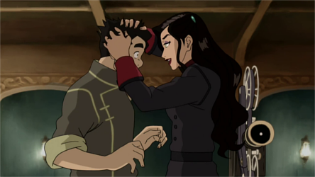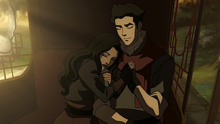 Two weeks later, Asami attended Varrick and Zhu Li's wedding at Air Temple Island. After the ceremony, Asami interrupted a discussion between Korra and Tenzin, before sitting down with Korra. The Avatar apologized for being gone for three years, but Asami told her she did not need to apologize, as she was glad to be with Korra now, opening up about her grief for her father. As Korra comforted her, Asami noted her relief for being able to forgive him. Asami proposed a vacation after everything that had happened, and after Korra enthusiastically agreed, Asami proposed traveling to the Spirit World. Preparing for their expedition, they approached the portal, gazing romantically into each other's eyes and beginning their romantic relationship.[9] The couple traveled all across the Spirit World, flying, swimming, and hiking through the landscapes. After losing their supplies, they decided to head home, but not before sharing their first kiss. Instead of returning to Republic City, Korra took Asami through the Southern portal to meet Tonraq and Senna, revealing their newfound relationship to Korra's parents. Although the chief and his wife were delighted to hear about it, Korra grew upset after her father cautioned that some people might be less accepting, and left for Republic City via the spirit portals.[13]
