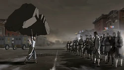 | Mako's doting over a recovering Korra puts a strain on his relationship with Asami. In the city, Tenzin fights off a kidnapping attempt of the Equalists and ends up the sole council member left, prompting him to request help from the United Forces. When Republic City comes under attack from Equalists, Team Avatar takes action. Back at Air Temple Island, Pema goes into labor while Lin Beifong and the three airbending children manage to defend the island. When more Equalists come, the islanders are forced to run, with Team Avatar retreating in the city's sewers, while Tenzin, his family, and the Air Acolytes flee on the sky bison. In order to secure the airbenders' safety, Lin fights off the Equalists, which leads to Amon taking her bending.