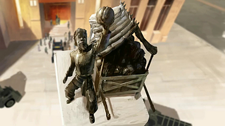Outside the building is a large statue commemorating Cai's first stand in Republic City. He is depicted standing atop a high pillar, while raising a cabbage in the palm of his hand.[9][11]