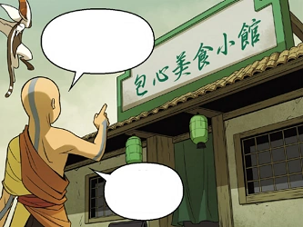 In 102 AG, Team Avatar visited the Earthen Fire Refinery in the town along with three Air Acolytes on the day of Yangchen's Festival. Before Aang decided to talk to the refinery's owners, he took the three acolytes away to teach them about how to perform a ceremonial meal. Since the tree that Aang and Monk Gyatso usually ate their meals under was cut down, the Avatar decided to take the acolytes to eat in the cabbage merchant's restaurant as it was in front of the tree's stump. Despite the acolytes' initial hesitation to enter the local due to the exclusive cabbage menu on the outside, the four of them and Momo came in, accidentally startling the owner.[1]
