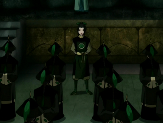 Princess Azula, alongside her friends Mai and Ty Lee, was tracking the Avatar using a fur trail Appa left behind. However, instead of finding Aang, she found the Kyoshi Warriors, who were taking care of Appa. Declaring that any friend of the Avatar was an enemy of theirs, Azula and her friends successfully attacked and captured the warriors, sending them back to a Fire Nation prison.[13] After making a plan to infiltrate Ba Sing Se, Azula and her friends donned their uniforms. When they traveled to Ba Sing Se and requested entry, Sokka vouched for them to the Earth King, assuming that they were Suki and the other Kyoshi Warriors.[3]