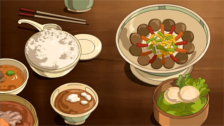 Spirit World cuisine consists of a mixture of food items inspired by or found among the four nations, appearing to consist mainly of naturally occurring fruit or dishes influenced by humans who have ventured into the realm, though few spirits have shown a need or desire to eat as spirit foods do not contribute to weight gain or loss.[200]