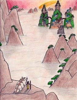 Siro repeatedly rubbed his eyes clear of water. Suddenly, he glimpsed more than just a white, foamy rush of liquid sweeping over him. A fiery, almost blindingly bright mass of fire flashed before his eyes, beginning as an immense globule and ending in a fine, streamlined tail. He saw two walls of energy form, azure to the right and amber to the left. The ground seemed to be shaking violently as the wall of amber slowly consumed the wall of azure. There was an explosion and a gleaming pillar broke through the sky.