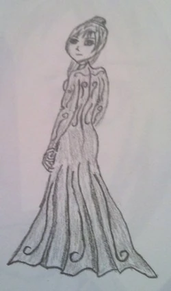 The dress was fit and lean, flowing with her body. It had a trailing skirt of about a foot. The sleeves were tight around the arms until the elbow where they loosened to great overhangs large enough to cross your arms in. The dress had a tight bodice making her look taller. There was a fold and hooks near the left shoulder where the dress was tied together.