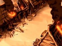 Where Colonel Tegan once stood rested now a large boulder; the settling dust coated it with a pale film, making the rock seemingly glow when the shafts of the morning sun penetrated the ocher curtain and glittered on the mica particles. The beautiful image was shattered, however, when cracks slithered like snakes over the surface, crumbling the sand coating and causing it to dribble down; the mighty rock crumbled like a sandcastle under the upcoming tide until nothing remained but a sharp spike aimed at the villager. A bang of bronze on earth resonated over the battlefield, and the spike shot forward. Tegan walked out of the sand haze with a jaunty toss of his thick dust-caked, brown curls and coughed lightly as he brushed the sand off his armor. Raising his head, his eyes locked onto the glazed look of the now-impaled earthbender. "Well, by the looks of it, that would still be you." With a grin, he squatted beside his meteor hammer and secured it back to his waist. "You know, just for future reference if you are ever lucky enough to reincarnate, you could have just said 'no'; you didn't have to be so brutal about it." Sensing the ever growing vibrations that could only be attributed to approaching footsteps, Tegan erected himself again, though not before mockingly tapping the fallen man's chest. "Now, if you'll excuse me. I'd love to stay and chat, but it seems like one of your pals is here to avenge you." Before Tegan could even make a move, however, the approaching villager sagged down and remained motionless on the ground. "What the ...?" Noticing the large smoking scorch mark adorning the center of the woman's back, Tegan looked in the direction she had come from and saw Seraphine holding target practice on the defenders. "Yow, Sera! Leave some for the rest of us, will ya? I had this one!"