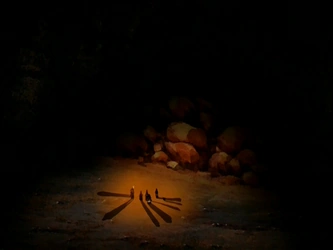 This dark tunnel, created by Marco through earthbending, leads into a larger cavern which is lit by a singular light globe. In this, there is a wall that contains many more tunnels that have been created by Molipedes. Marco has only created one tunnel, which leads onto a mountainside on the other side of Gao Lin. The Molipede burrows are extensive and maze-like.