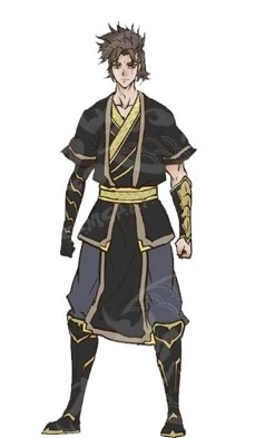 He has shoulder-length brown hair and charcoal gray eyes. He has a large vertical scar over his left eye. He wears black clothing, wearing a loose black shirt with red lines and thin gold stripes on the sleeves, a sort of coat. His right arm was completely covered by a black sleeve with gold stripes, and he wore a black armband with gold embossing on the left. His boots match his shirt, including the gold trim around the knees, shins, and foot blades. His pants are dark gray and tucked into his boots.