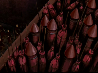 A collection of flares were readied to be fired at a Fire Nation colony festival.