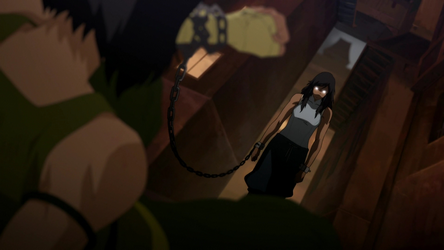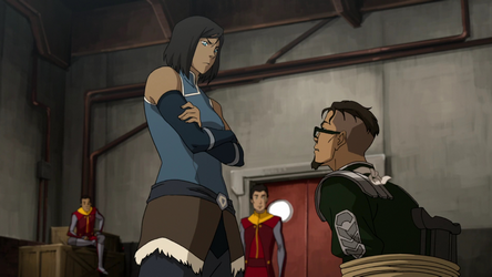 When Bolin got kidnapped by the Equalists, Korra helped his brother find him. They tracked him down to an abandoned warehouse where they witnessed firsthand Amon's ability to strip a bender of their bending abilities.[17] Although they managed to save Bolin, Amon left a deep impression on Korra, who grew fearsome of the Equalist leader. Regardless, she joined Councilman Tarrlok's task force.[18]