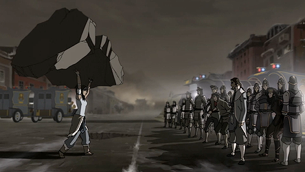 Korra attempted to intervene in tensions between Southern Water Tribe civilians and Northern military forces.