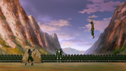 In order to let Kuvira and the rest of the world know that the Avatar was back, Korra and the three airbenders traded the swamp for Zaofu, though they discovered that the military of the Earth Empire was already camped at its gates. Believing that conflict had only made things worse in the past, Korra set out to negotiate with Kuvira though she was urged to convince Suyin to give the city up. Upon her return to the city, Korra learned that Suyin had left with Wei and Wing to sneak into Kuvira's camp and deal with the threat themselves.[54] When Kuvira announced over the city's communication system that Suyin and the twins had been captured, Korra tried to reason with the army commander, though she ended up being challenged for a one-on-one duel for the fate of Zaofu. Kuvira had the upper hand until Korra entered the Avatar State. On the verge of ending Kuvira, however, she was plagued by another hallucination of herself in the Avatar State, allowing the army commander to recover and defeat her. As Kuvira moved to kill her, she was saved by Jinora and Opal and escaped from Zaofu with them, Ikki and Meelo.[55]