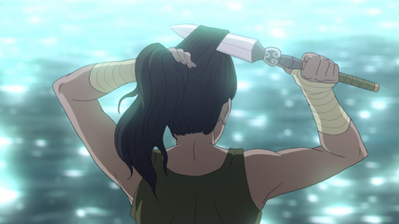 Korra is also a highly proficient unarmed fighter, able to knock out opponents with a single kick, simultaneously dodge an attack while sweep-kicking the enemy's legs, and once subdued a man using only Mako's scarf. Even against an expert weapons-wielder like the Lieutenant, Korra skillfully parried and countered his close-range assault. Furthermore, with a combination of bending attacks, she was able to create openings and land powerful physical blows, ultimately defeating him. Even without her bending, she was able to defeat several chi-blockers before being rescued by Naga.[39]