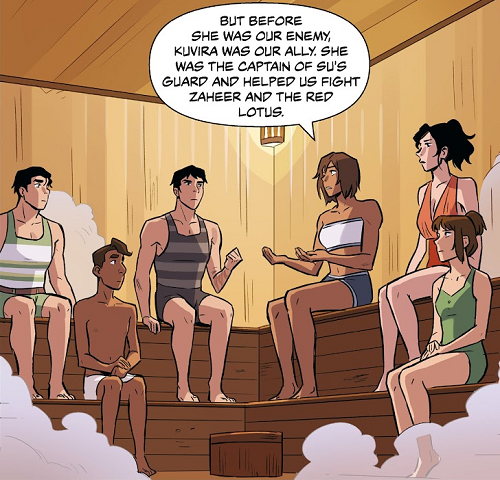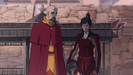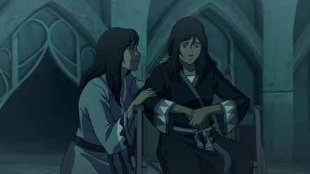 Korra and Asami eventually managed to free themselves and prevent being taken back to Ba Sing Se. Their escape left them and the airship crew stranded in the Si Wong Desert, forcing them all to work together to reach the safety of the Misty Palms Oasis, where they once again met up with Mako, Bolin, Lin, Tonraq, and Zuko and learned that Zaheer had killed the Earth Queen[45] and threatened to do the same with the airbenders at the Northern Air Temple lest Korra surrendered herself to them.[46]