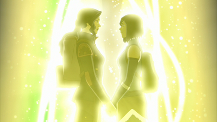 Korra and Asami held hands and gazed at each other lovingly as they entered the spirit portal, beginning their romantic relationship.