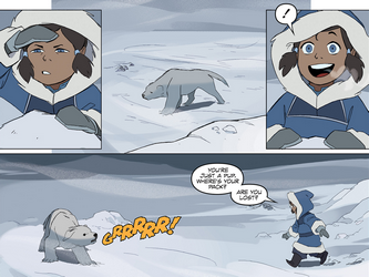 Korra discovered a lone polar bear pup in the South Pole after searching the tundras in the middle of a storm.