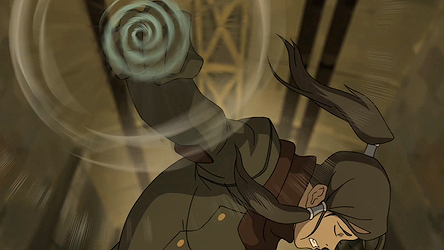 Unlike the prior three elements, airbending did not come easily to Korra. Tenzin explained that it was due to its innate nature of being the most opposite to her personality. While initially having difficulty with airbending's fighting style and battle tactics, during her first pro-bending match, she was able to employ basic airbending movements to dodge the opposing team's assault and ultimately tire them out to win the match for her team.[16] As her training has progressed, her understanding of its techniques greatly improved, and she was able to quickly and gracefully progress through the gates and ultimately learned all of its physical maneuvers;[17][22] she later applied these tactics against the Lieutenant, effectively dodging all his attacks.[20]