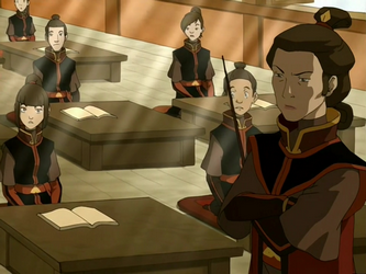 After Aang was brought to the school, Ms. Kwan assumed he was a new student from "the colonies" in the Earth Kingdom. After calling him a slob, she immediately taught him proper posture and Fire Nation etiquette. The next day, after Aang failed to recite the "Fire Nation Oath" properly, she assumed he was making a mockery of the Fire Nation and announced a pop quiz. Her first question asked for the year in which Fire Lord Sozin defeated the Air Nomads' army. Aang, confused, pointed out to the stunned class that the Air Nomads had no formal military and were defeated by ambush tactics – a fact apparently erased from Fire Nation history books. Ms. Kwan responded by saying that he could not possibly know that for a fact unless he had been there a hundred years prior, to which Aang quickly replied that he would just write down his best guess.[1]