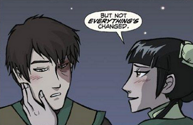 As he chased her down an alley, Zuko exclaimed that she could have gotten him killed, but Mai merely laughed it off. Zuko stopped to point out that she finally seemed to be enjoying herself, going on to say that he had missed seeing this side of her. Mai admitted that a lot had changed since the days when she "used to throw mud in his face", but not everything had changed; she proved this by kissing him softly. The next day, the two of them arrived at the ship to leave for the Fire Nation together.[22]