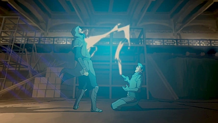 Mako uses lightning to distract Amon so he and Korra can save the airbenders.