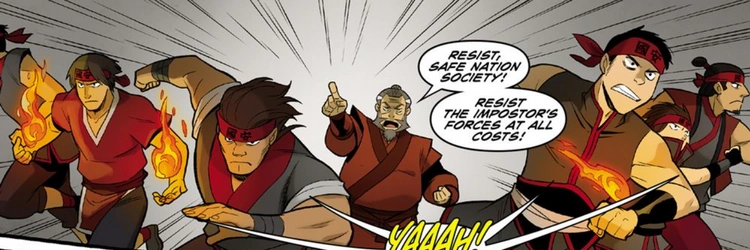 Following the Kemurikage crisis, plots against Zuko's government continued. Despite the surrender of Ukano, a number of New Ozai Society members remained at large and committed to their dwindling cause; they still posed a threat.[17] Elements of the Fire Warriors also began to operate without Azula's direction, targeting Zuko and his allies.[15]