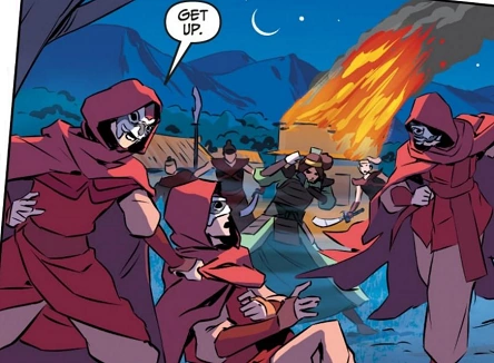 At some point, dissidents began to plot the murder of Zuko's supporter Iso. The plot was discovered by Pin-Yi, a young petty criminal. He tried to warn the authorities, but no one initially believed his claims about the assassination plot. At the same time, some Fire Warriors also learned of the conspiracy and sought to exploit the potential murder of Iso for their own gain, hoping to incite a riot in the capital to undermine Zuko's reign.[6]