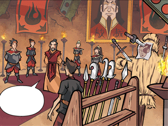 Unrest also festered in the older Fire Nation colonies, where ethnically diverse populations vehemently opposed the idea of being forcibly uprooted from their homes. Many colonists, such as Mayor Morishita of Yu Dao, regarded Zuko as a traitor for betraying the colonies to the Earth Kingdom.[8] Despite these challenges, Zuko successfully assembled a cohort of officials who were firmly loyal to his idea of a reformed Fire Nation.[15] Among these supporters was Iso, a high-ranking Fire Nation military official, who provided important support to the young Fire Lord's early rule.[6]