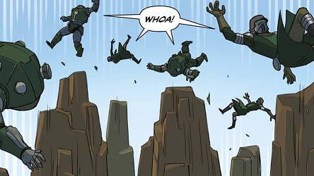 Several Earth Empire soldiers are flung into the air by Suyin, Kuvira, and Toph.