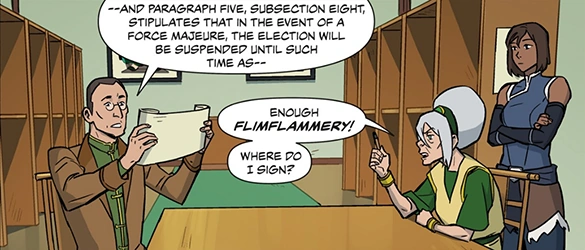 Inside the voting room of the town hall, Mayor Rhee and Toph sit down as he reads the contents of a scroll aloud to her. Toph cuts him short, simply asking where she has to sign. Rhee points out the spot to her, and Korra takes her wrist to guide her in signing, congratulating her on officially being a candidate for governor of Gaoling, which Toph unenthusiastically cheers. She asks the mayor to be frank about her chances, to which he tells her that usually he would be confident of her changes, but remarks on the overnight surge in support for Guan.