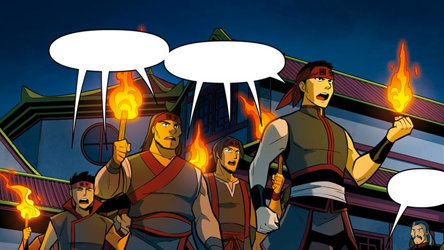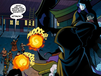 They continued to march through the streets until Fire Lord Zuko returned, condemning the assembly of a militia group and the enforcement of a curfew without his approval. He suspended Sung for undermining his authority before ordering the disbandment of the group, threatening arrest for any individuals who refused to comply.[1]
