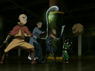 The group disbanded for a week: Aang met with a guru, who would teach him to control the Avatar State, Sokka was reunited with his father after two years, Katara remained in the city to help the generals plan the invasion of the Fire Nation, and Toph, while attempting to visit her parents, was unexpectedly kidnapped and imprisoned in a metal box,[9] where she would discover the secret of metalbending.[35] After abandoning his training with the guru and reuniting with Sokka, Aang teamed up with Iroh and saved Katara and Zuko from the Crystal Catacombs of Old Ba Sing Se. Iroh pleaded with Zuko to reform and change his antagonistic ways; however, after a cunning offer to restore his honor from his sister, Azula, he changed sides and joined her. After Aang entered the Avatar State, Azula fired a bolt of lightning at him, striking and killing him. Immediately following this, Katara saved him by using her special water from the Spirit Oasis.[36]