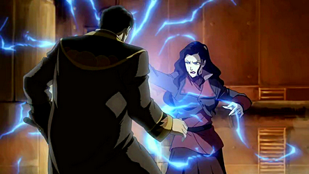 Asami chooses to side with Team Avatar as opposed to the Equalists and her father, electrocuting him as a result.