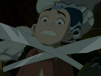 Inside his cell, Aang hears the scuffle and eyes the door with apprehension as the lock is being turned. He gasps as a masked figure enters and unsheathes his dual broadswords. Swinging the weapons, the man advances on Aang, who screams. To Aang's surprise, however, the figure slices through his bonds, freeing him. As the figure retreats without saying a word, Aang asks him who he is, what is going on, and wonders if the man is there to rescue him. The figure does not respond, though opens the door and signals for the Avatar to follow him. Believing he means him no harm, Aang follows him. He passes by the tied up guard and notices his partially frozen frogs are making their escape through another hallway. Trying to gather them, Aang is pulled away by the masked stranger, though protests loudly that his friends needs to suck on the animals.