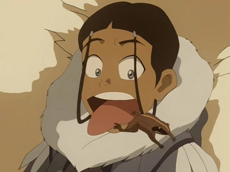 Katara is startled upon realizing that she is sucking on a living wood frog.