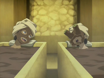 The girls leave the spa with heavy make-up on their faces. Toph comments that while she does not usually do fancy things, it is not something she dislikes. As they cross a bridge, three older girls, led by Star, make fun of Toph's makeup. Toph becomes visibly upset by these remarks and Katara urges her to ignore them. Toph, however, forces a laugh back at the girls and earthbends a hole in the bridge, sending them into the water below. Believing it to be the only appropriate action, Katara finishes with her own parting shot by washing the girls downstream with a large wave.