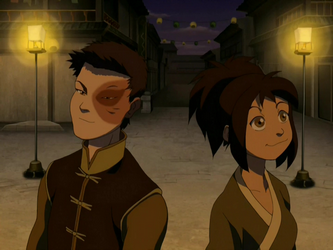 After their awkward dinner, Jin pulls Zuko off to one of her favorite parts of the city, the Firelight Fountain. At night, the fountain is usually lit by lanterns in the evening and causes the water to sparkle. However, when they get there, the lanterns are all dark and unlit. Sensing her disappointment, Zuko tells Jin to close her eyes. Making sure that no one else is around to watch, he quietly lights all the lanterns with his firebending. Jin and Zuko stare into the fountain and Jin reaches out and holds his hand. Slyly, she tries to give Zuko a kiss, but Zuko holds up a coupon for a free tea between them and gives it to her. Nonplussed, she tells Zuko to close his eyes so she could present her gift to him. She kisses him lightly and briefly. Zuko gives her a brief kiss in return, but quickly breaks away and leaves. When Jin asks him the reason, he simply says that "it's complicated" and heads back to the teahouse.