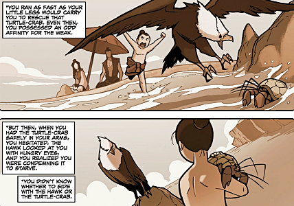 Even as a three-year-old child, Zuko already displayed a strong sense of morality, as he wanted to save both the eagle hawk and the turtle crab.